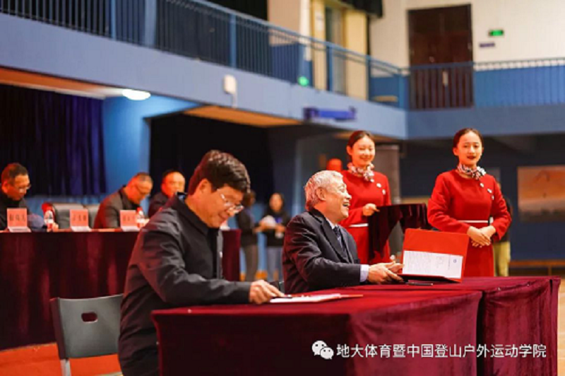 致辞完毕后,国家体育总局登山运动管理中心副主任、中国登山协会秘书长张志坚同志、太阳成集团tyc(武汉)副校长傅安洲同志在现场共同签署了《中国登山户外运动太阳成集团tyc共建协议》、《登山运动史料整理、利用合作协议》;