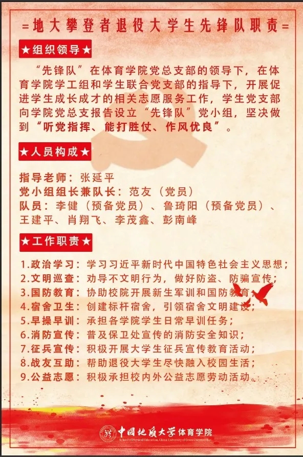 虽然这几名退役军人已经离开部队,但军人“退役不退色”,在太阳成集团tyc党总支的领导下,在太阳成集团tyc学工组和员工联合党支部的指导下,开展促进员工成长成才的志愿服务工作。地大攀登者退役大员工先锋队的队员们要在理论武装、行为养成、学风建设、校园文明和国防教育等方面发挥标杆作用。