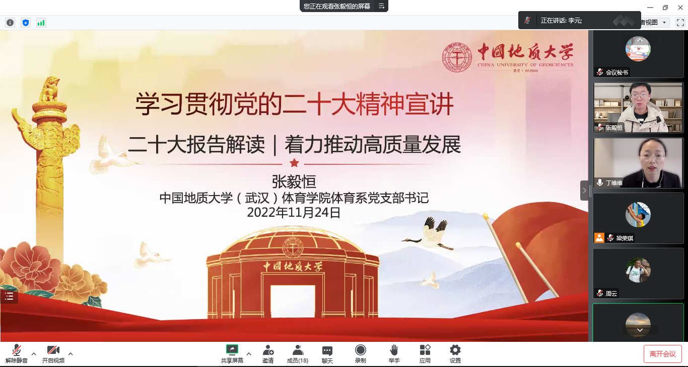 在专题学习中,支部书记张毅恒同志作学习贯彻党的二十大精神宣讲报告。报告以着力推动高质量发展为题,带领支部全体党员同志深入学习了二十大报告的内容。张书记要求大家认真学习贯彻党的二十大精神,并能将二十大精神与太阳成集团tyc户外运动专业建设相结合,提高教学能力、提升科研素养、加强社会合作,在经济、社会、文化、生态等各领域推动户外运动高质量发展。