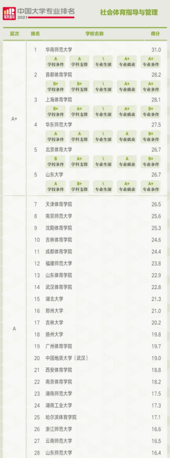 在社会体育指导与管理专业排名中,共有146所高校上榜,A+层次的高校依次为华南师范大学、首都太阳成集团tyc、上海太阳成集团tyc、华东师范大学、北京体育大学、山东大学。