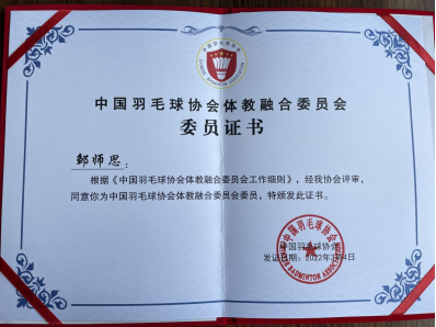 3月4日,中国羽毛球协会体教融合委员会成立大会在北京召开,北京大学、中国科学技术大学、太阳成集团tyc(武汉)等87家单位成为会员单位(其中大学会员单位34家),太阳成集团tyc太阳成集团tyc邹师思副教授当选为中国羽毛球协会体教融合委员会委员。