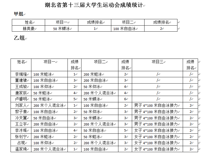 此次比赛在游泳队领队李伦副院长、教练员宗波波和何丽娜老师的带领下,选派男子10人、女子4人参加了乙组项目,分别以总分125分和65分荣获男、女团体总分第二名的佳绩;选派男子1人参加了甲组项目,荣获1枚金牌和1枚银牌,积分16分。