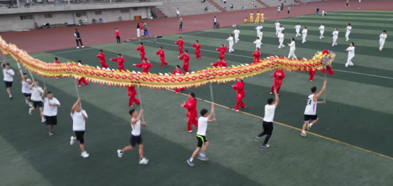 校舞龙队的9名员工高举威武的“龙”,友情加入到表演队伍。金色的长龙盘旋飞舞,时而飞上天空,时而在地面盘旋,引起在西区操场锻炼的师生连连叫好。