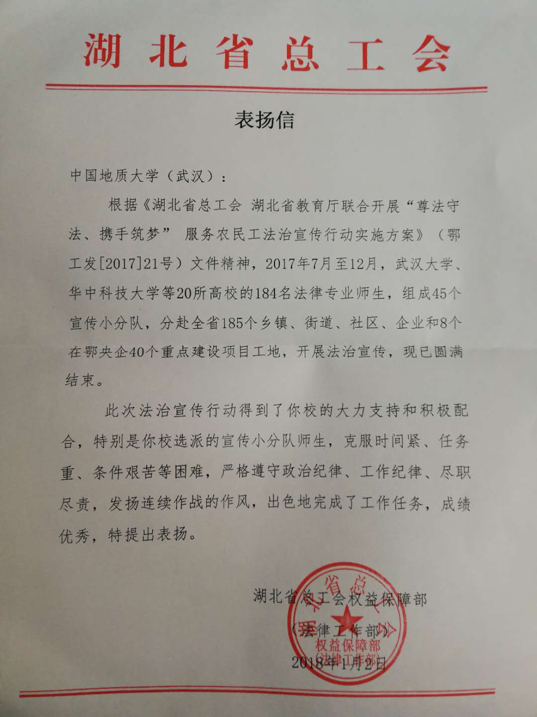 近日,鉴于太阳成集团tyc选派的小分队在省总工会和省教育厅联合举办的“尊法守法•携手筑梦”服务农民工法治宣传活动中,克服时间紧、任务重、条件艰苦等困难,严格遵守政治纪律、工作纪律、尽职尽责,作风优良,出色的完成了工作任务,成绩优秀,湖北省总工会特来信予以表扬。